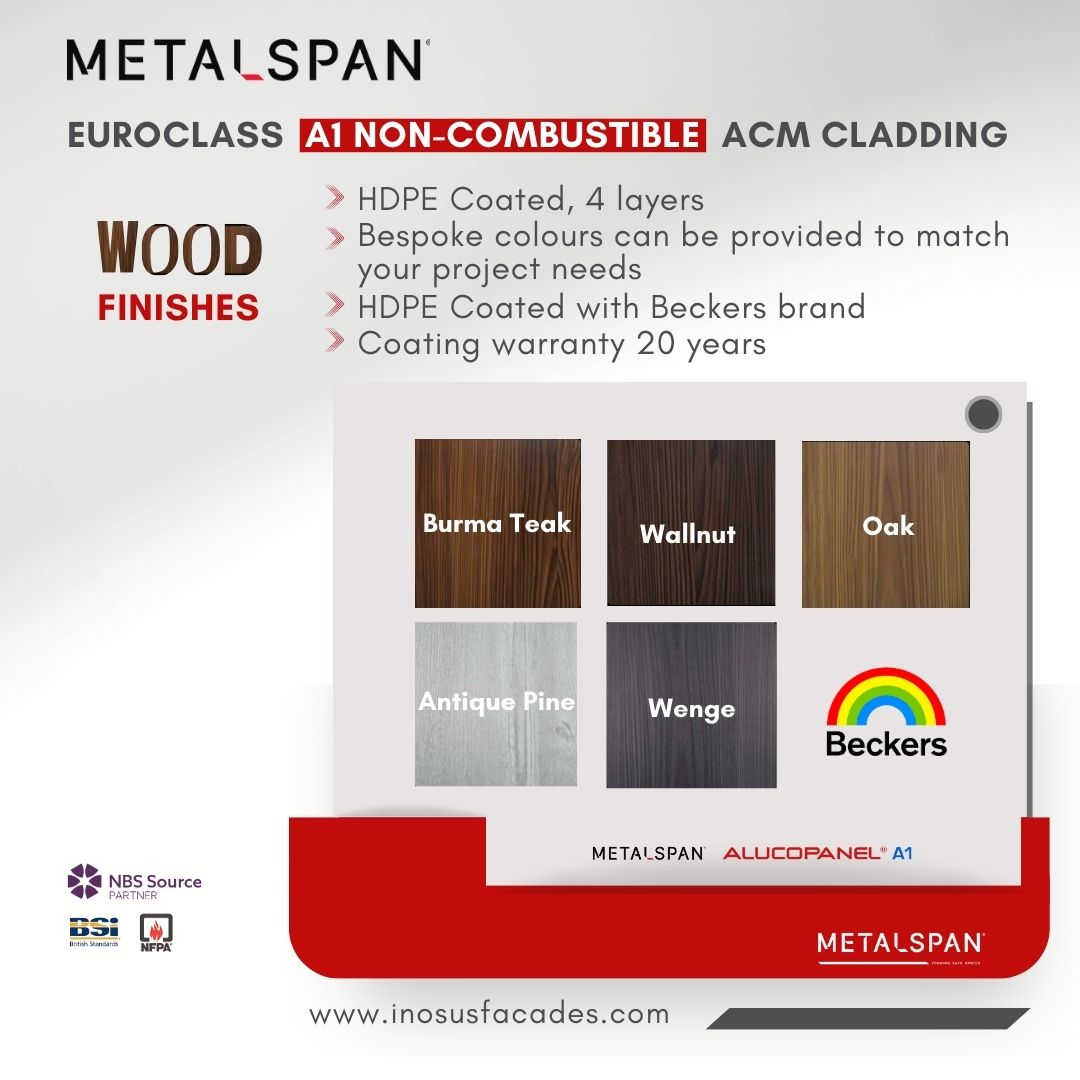 METALSPAN by ALUCOPANEL A1 non-combustible ACM cladding in stunning wood finishes combines the natural warmth of wood with advanced HDPE coatings from Beckers Group ensuring beauty and safety of your building. Plus, with Alucopanel's in-house coating line, we can respond quickly to your needs.