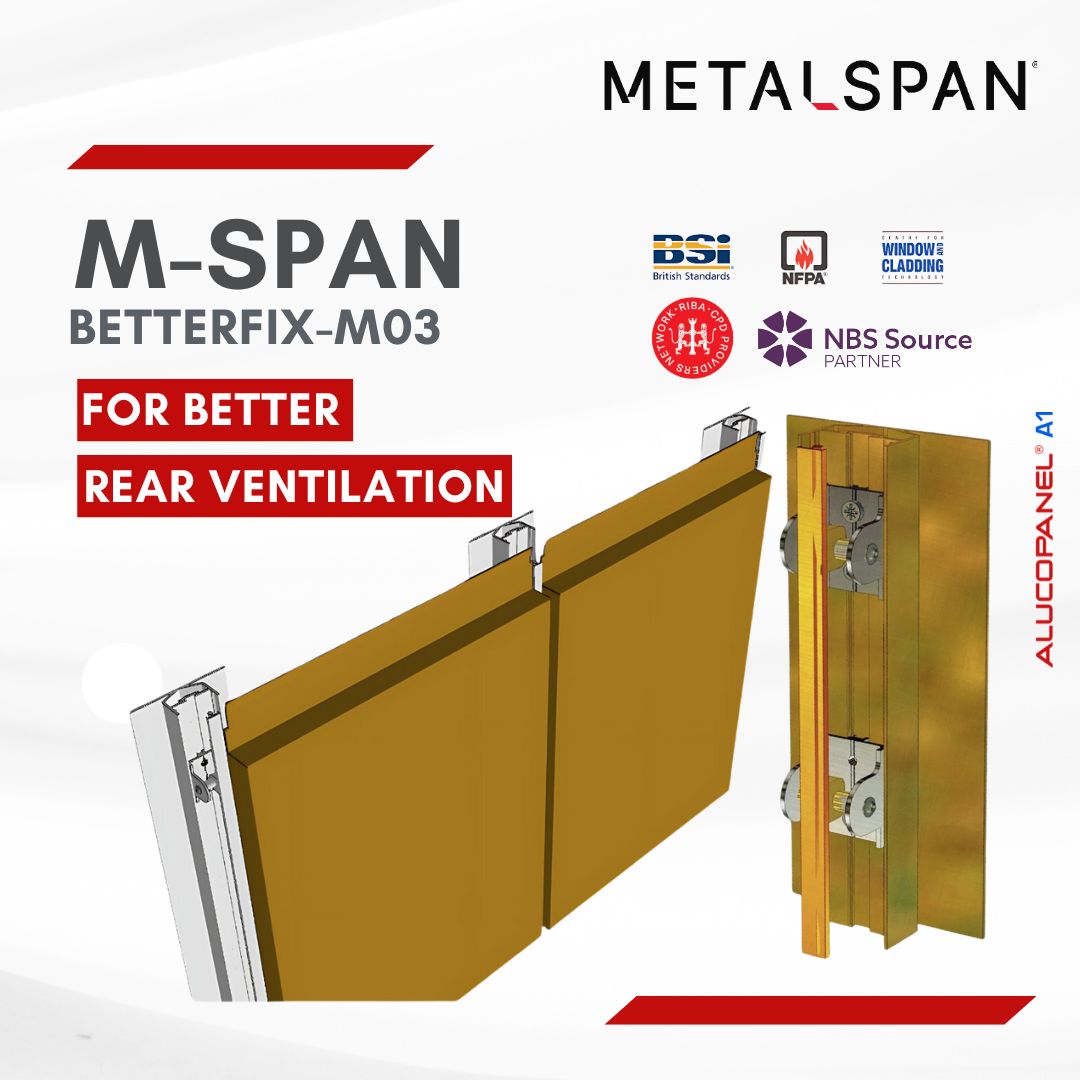 The METALSPAN®️ advanced rainscreen cladding system, featuring the METALSPAN by ALUCOPANEL Euro Class A1 Aluminium Composite Material (ACM) cladding, offers a seamless aesthetics by concealing fixings behind the panels. The M-SPAN M03 BetterFIX system, incorporating helping-hand brackets and adjustable carriers, ensures quick, easy and efficient panel installation.
