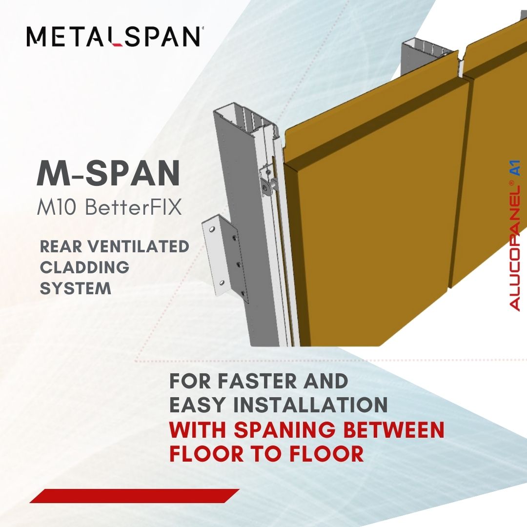Our M-SPAN M10 BetterFIX Rainscreen Cladding system is designed to simplify and accelerate installation. Featuring the proprietary M-SPAN M10 BetterFIX profile, it is designed and engineered to span between floors where there is challenges to have brackets at 600mm centers. This offers enhanced flexibility and significantly reduces installation time. Additionally, our system ensures convenient access to individual panels for installation, removal, and maintenance.