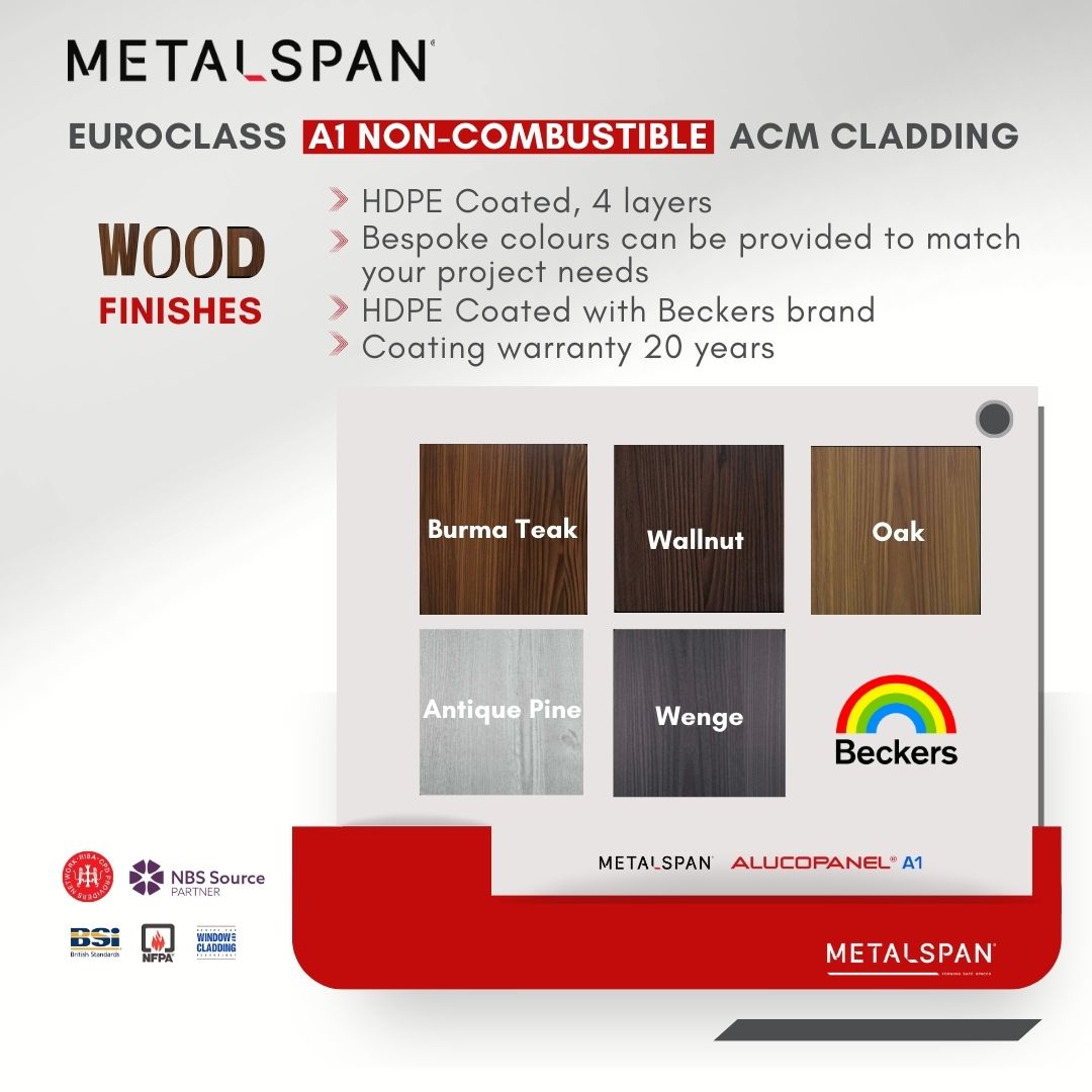 METALSPAN by ALUCOPANEL A1 non-combustible ACM cladding in stunning wood finishes combines the natural warmth of wood with advanced HDPE coatings from Beckers Group ensuring beauty and safety of your building. Plus, with Alucopanel's in-house coating line, we can respond quickly to your needs.